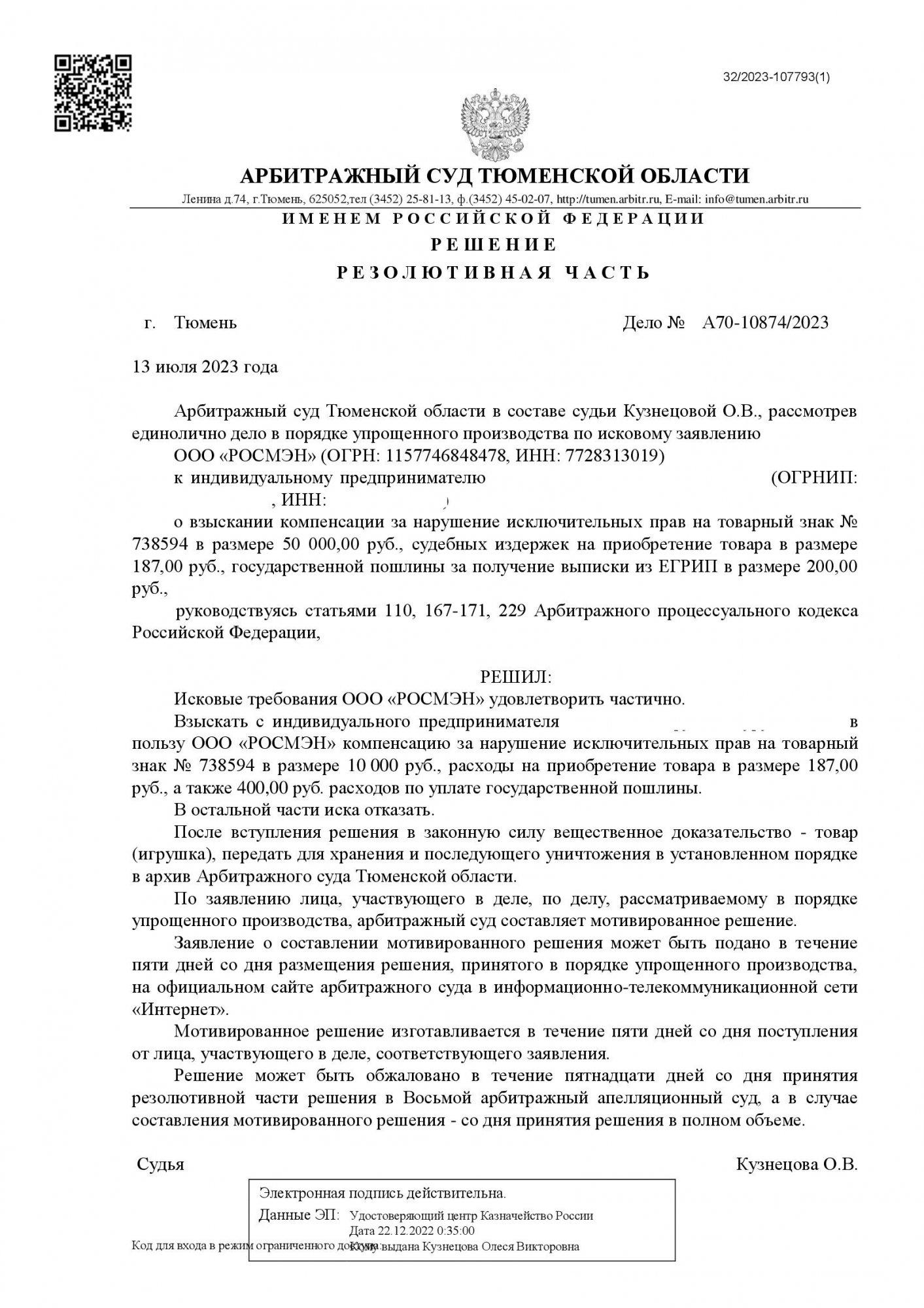 ООО «Росмэн» обратилась в Арбитражный суд г. Тюмень с иском к Индивидуальному предпринимателю с требованием о взыскании компенсации за нарушение исключительных прав на изображение произведения изобразительного искусства - героев мультфильма «Дикие Скричеры» в сумме 50 000 руб. Была произведена контрольная закупка игрушек на сумму 187 рублей.