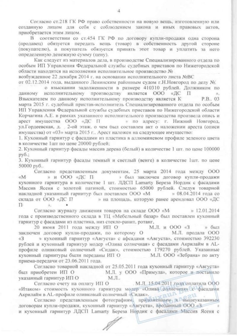 В деле разбиралась юрист, обладающая значительным опытом юридической помощи бизнесу. Она изучила предысторию дела и обнаружила, что один и тот же гарнитур был продан дважды разным собственникам под разными названиями. С помощью документальных свидетельств, фотографий и прочих доказательств ей удалось показать на суде, что единственным владельцем кухни является наш клиент ООО "З".